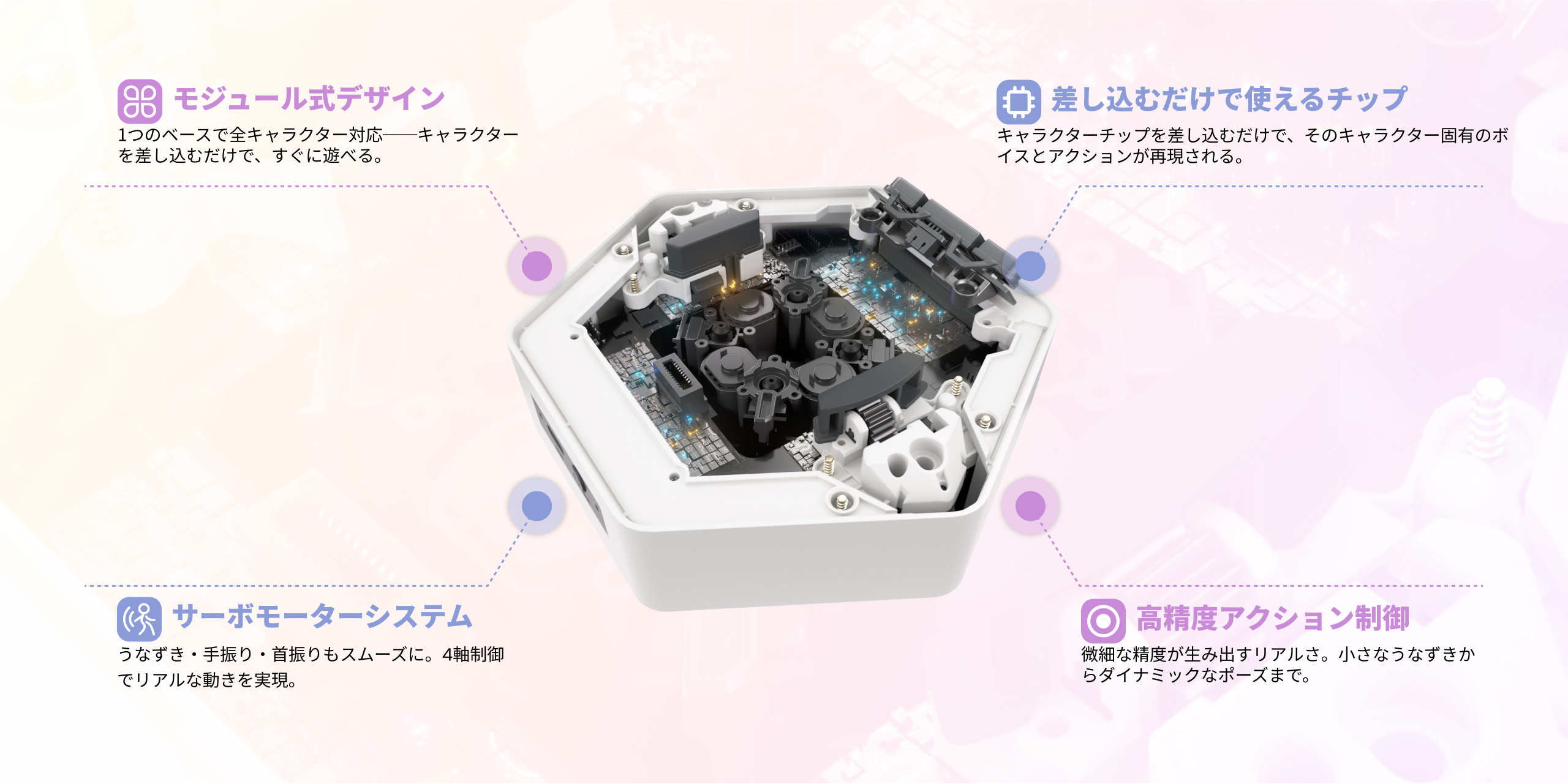 楽しさの裏にはハイテクシステムが隠れています。1つのベースで、すべてのキャラクターを動かせ、差し込むだけで音声とアクションが瞬時に解放されるプラグインチップ、そして精密サーボモーターによって、すべての動きがスムーズに再現されます。